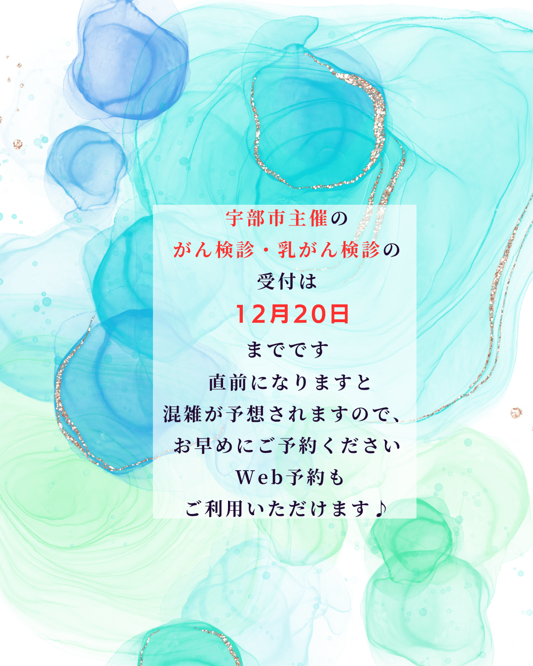 宇部市の「がん検診」「乳がん検診」は、12月20日(土)までです。直前になりますと、たいへん混み合いますので、どうぞお早めにお越しください。