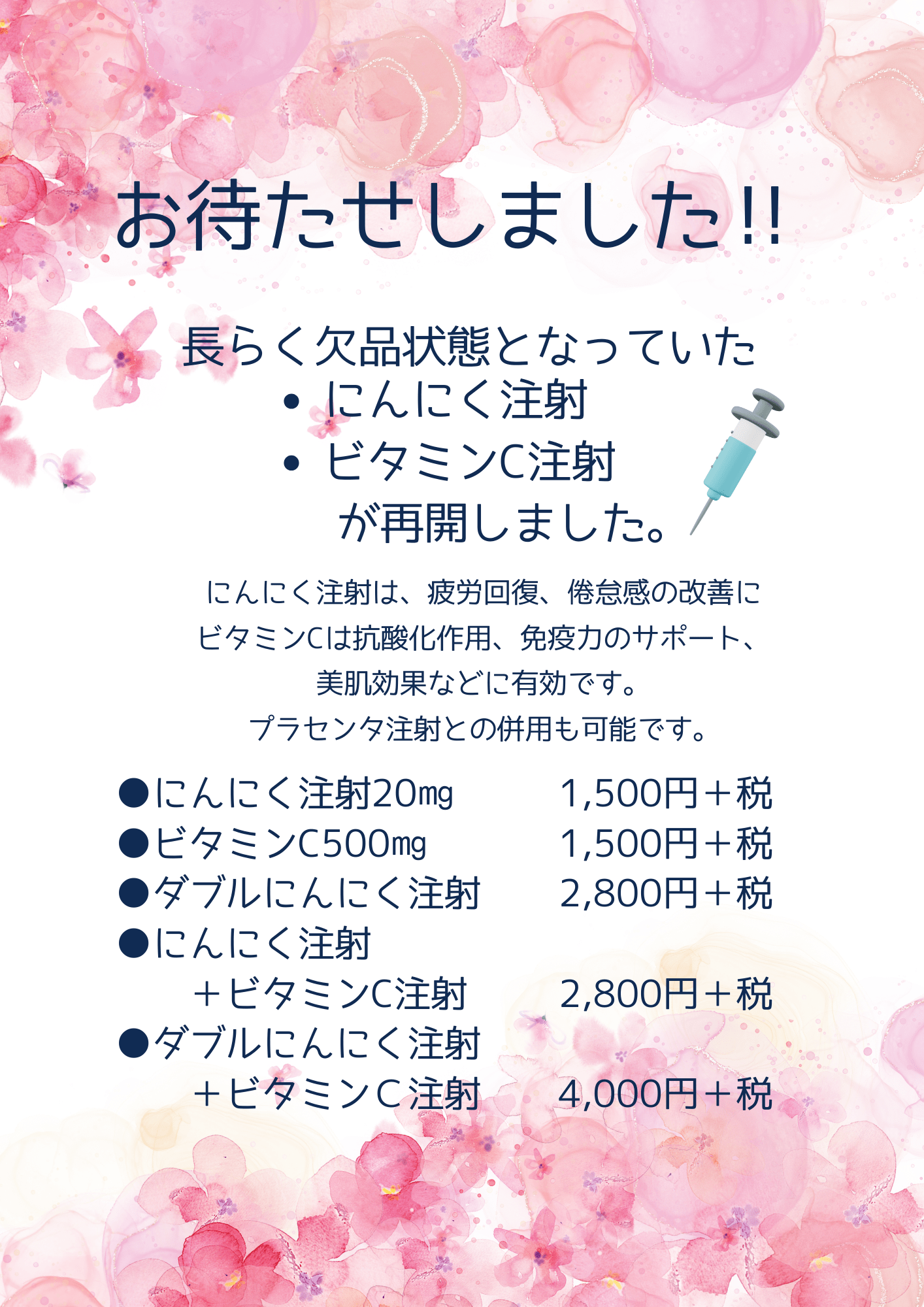 ・にんにく注射20mg 1,500円+税 ・ビタミンC500㎎ 1,500円+税 ・ダブルにんにく注射 2,800円+税 ・にんにく注射+ビタミンC注射 2,800円+税 ・ダブルにんにく注射+ビタミンC注射 4,000円+税